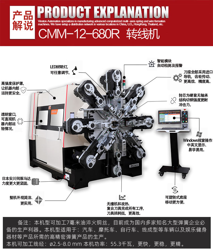 2、擁有傳統8工位機械(xiè)之優點(生產高難度的彈簧、更容(róng)易、更快捷、更精確)。