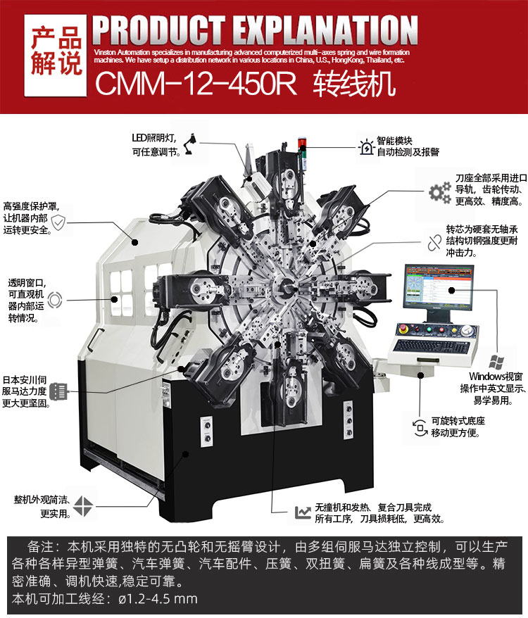 - 產品(pǐn)概(gài)述: CMM-12-450R 轉線(xiàn)彈簧機可生產ø1.2-4.5 mm線徑彈(dàn)簧及線成形等),本機采用獨特的無凸輪和無搖臂設計(jì),由多組(zǔ)伺服(fú)馬達獨立控製,可以生產各種各樣異型彈簧、汽車彈簧、汽車配件、壓簧、雙(shuāng)扭簧、扁簧及各種線成型等。精密準確、調機快(kuài)速、穩定可靠。