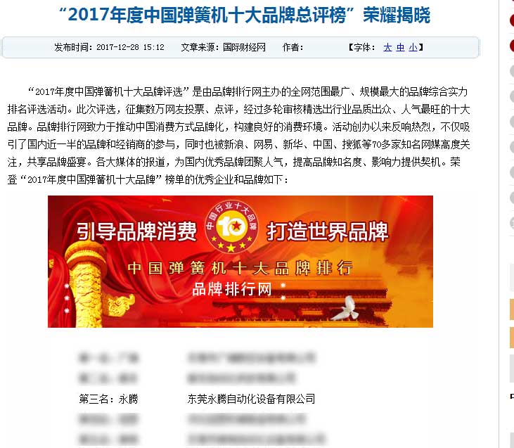 “2017年(nián)度中國彈簧機十大品牌(pái)評選”是由品牌排行網主辦的全網範圍最廣、規模最大的品牌(pái)綜合實力排名評選活動。此次評選,征集數萬網友投票、點評,經過多輪審核精選出行業(yè)品質出眾、人(rén)氣最旺的十大品牌。品牌排行網致力於推動中國消費(fèi)方式品牌(pái)化,構(gòu)建良好的消費環境(jìng)。活動創辦以來反響(xiǎng)熱烈,不僅吸引了國(guó)內近一半的品牌(pái)和經銷商的參與,同(tóng)時也被新浪、網易、新(xīn)華、中國、搜狐等70多(duō)家知名網媒高度關注,共享品牌盛宴(yàn)。各大媒體的報道,為國內優秀品牌(pái)團聚人氣,提高品牌知名度、影響力提供契機。