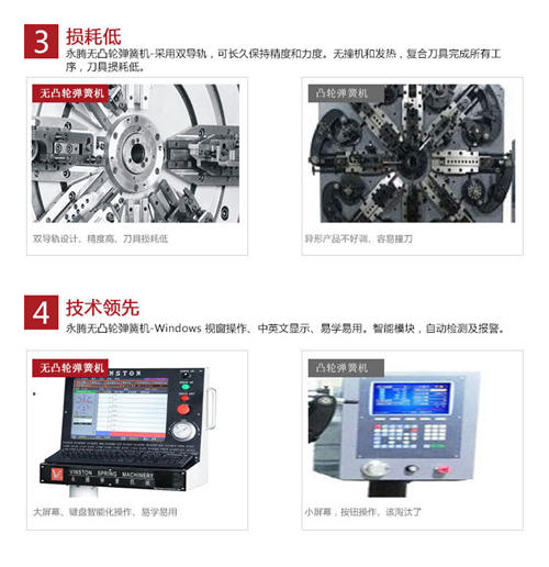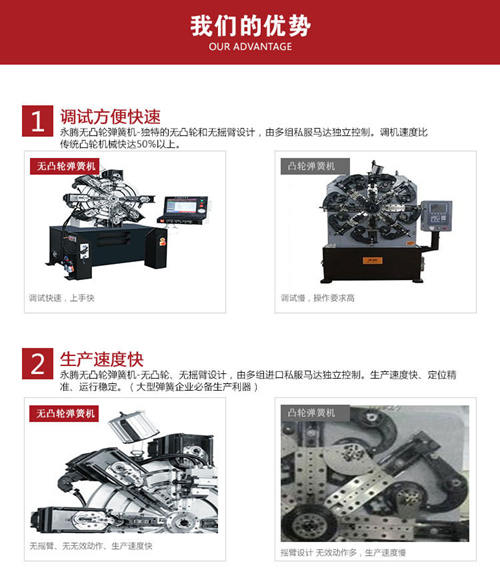 在近幾年無凸輪彈簧機逐漸得到彈簧生產廠家的認可。與傳統帶凸輪彈簧機相比,91av在线免费观看無凸(tū)輪彈簧機在設計上采用獨特的無凸輪和無搖臂設計(調機速度比傳統(tǒng)凸輪機快達50%以上),其中無(wú)撞機(jī)和發熱、複合刀具完成所有工序,刀具損