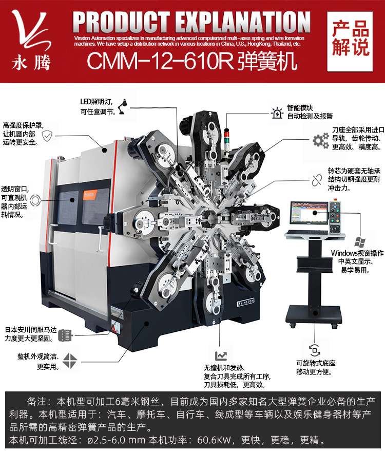 • 產(chǎn)品概述: CMM-12-610R 電腦彈(dàn)簧機 可生產ø2.5-6.0 mm線徑彈簧及線成(chéng)形(xíng)等)本機采用獨特的無凸輪和無搖臂設計,由多組伺服馬達獨立控製,可以生產各種各(gè)樣異(yì)型彈(dàn)簧、壓簧、拉簧、雙扭簧、渦卷簧、扁簧(發條簧)汽車配件,汽車彈(dàn)簧,家具五金,衛(wèi)浴(yù)線材成型及複雜線材成型等。精密準確、調機快速、穩定(dìng)可靠。