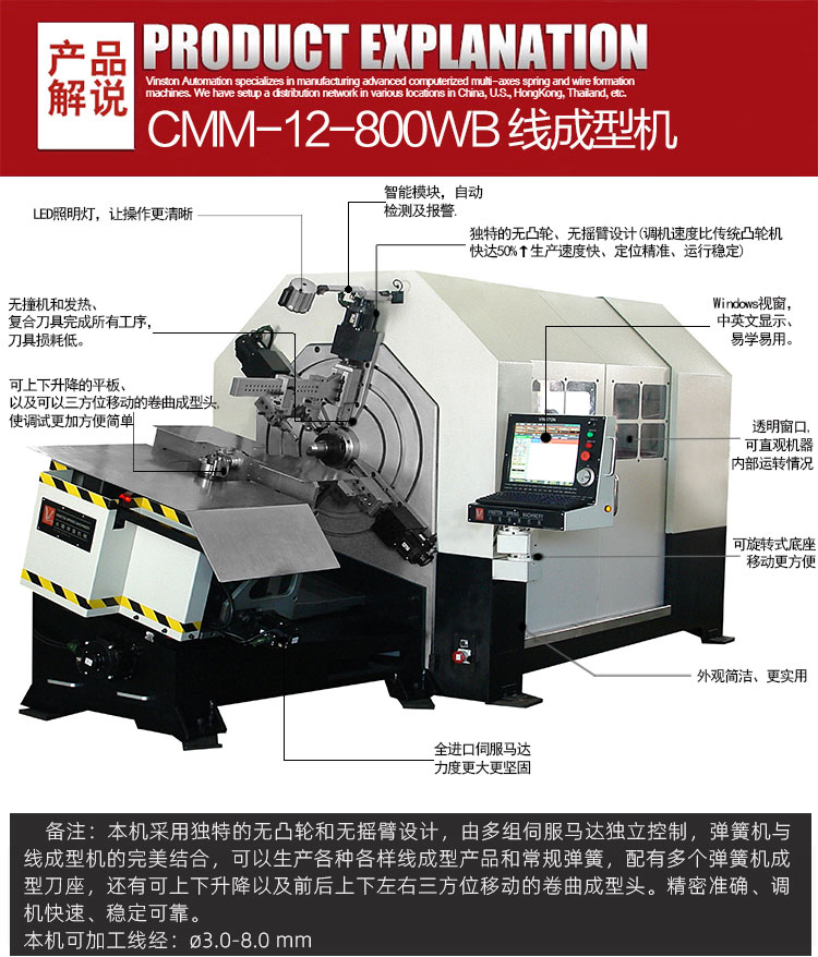 - 產品概述: CMM-12-800WB線材成(chéng)型機(jī)可生產ø3.0-8.0 mm線經線(xiàn)成型)本(běn)機采用獨特(tè)的無凸輪和無搖臂設計,由多組伺服馬達獨立控製,彈簧機與線成型機的完美結(jié)合,可以生產各種各(gè)樣線成型(xíng)產品(pǐn)和常規彈簧,配有多個彈簧機成型刀座,還有可上下升降以及前後上下左右三方位移動的卷曲成型頭。精密準確、調機快速、穩定可靠。