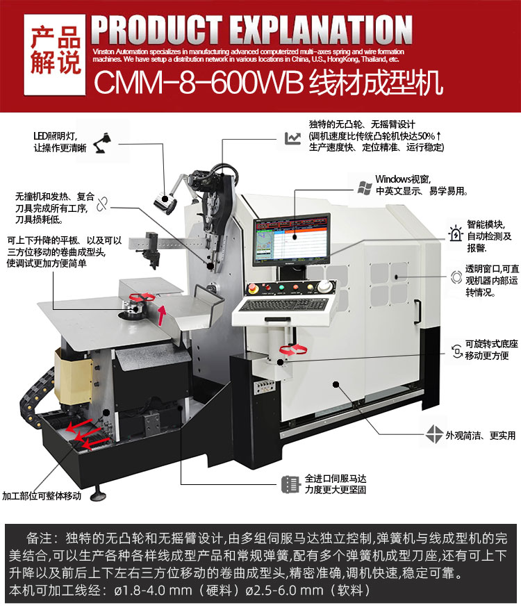 - 產(chǎn)品概述: CMM-8-600WB 線(xiàn)材成型機可生產ø1.8-4.0 mm線經鐵線或者低(dī)碳鋼可做ø2.5-6.0 mm,本機專業生產汽車零部件(jiàn)等線成(chéng)型,特別適合做大杆件汽車五(wǔ)金線材成型產品帶平板的(de)線材折彎成型機,既具備精密(mì)彈簧機的精度,又超越普通線成型機的速(sù)度,生產汽(qì)車零部件和廚衛五金製品以及其他日用五金製(zhì)品非常適合。具有設計直觀,調試方便(biàn),速度快的亮(liàng)點。