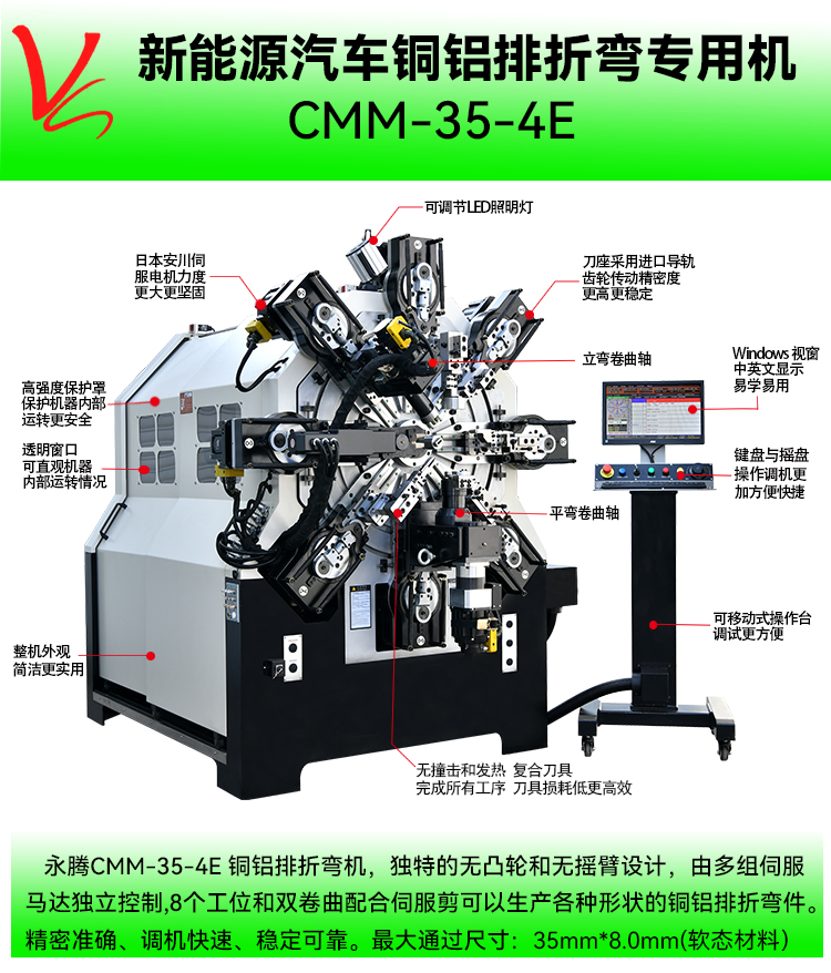 • 產品概述: CMM-35-4E銅排折(shé)彎機(最大通過尺寸:35mm*8.0mm)集3D折彎機和彈簧機(jī)所有的功能於一體的多功能專用機,本(běn)機采用獨特(tè)的無凸輪和無搖臂設計,由多組伺服馬(mǎ)達獨立控製,91av在线免费观看銅排折彎機廣泛(fàn)應用(yòng)於導電(diàn)排成型,新能源(yuán)電池連接排、新能源電池模(mó)組、銅母排成型、硬排成型、導電排、電池連接排、銅排(pái)、裸排成(chéng)型(xíng)等。精密準確、調機(jī)快速、穩定可(kě)靠。
